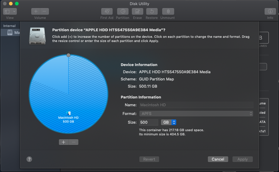 Находим в меню MacOS дисковую утилиту, открываем ее и выделяем наше устройство хранения данных. В моем случае это SSD на 500 ГБ. Выделив устройство жмем на кнопку 'Partitioning'.